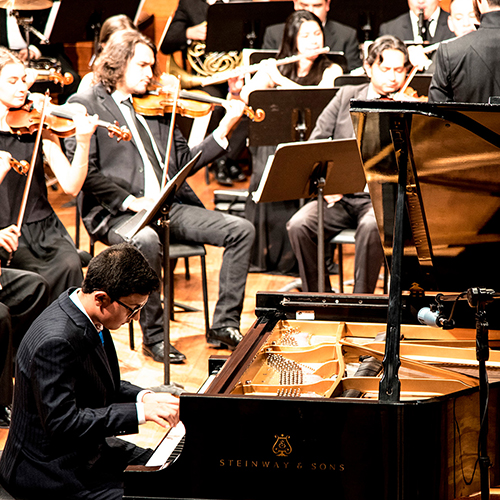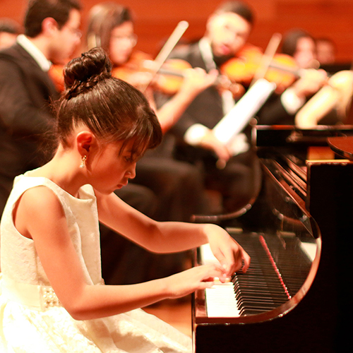 Diciembre de 2017. 40 músicos, dirigidos bajo la batuta de Camilo Rojas, acompañaron a 15 pianistas solistas desde los 6 hasta los 16 años de edad. En esta oportunidad, la música colombiana fue la gran protagonista. Fotografía: Daniel Serrano Photography.